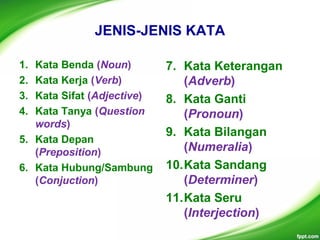 Jenis kata ini umumnya digunakan sebagai predikat pada suatu kalimat. Apa jenis kata itu. Dalam Kamus Besar Bahasa Indonesia kata kerja adalah kata yang menyatakan proses perbuatan dan tindakan.